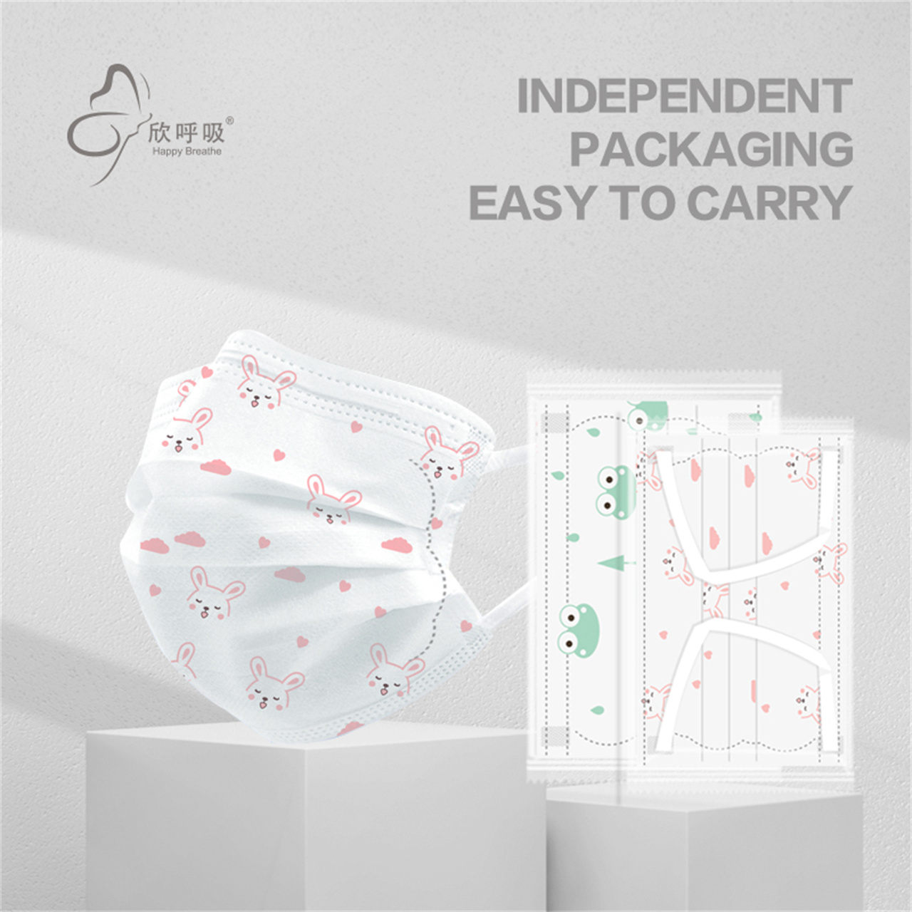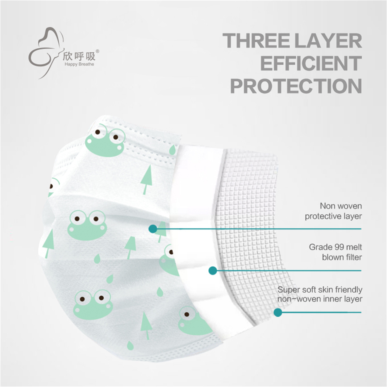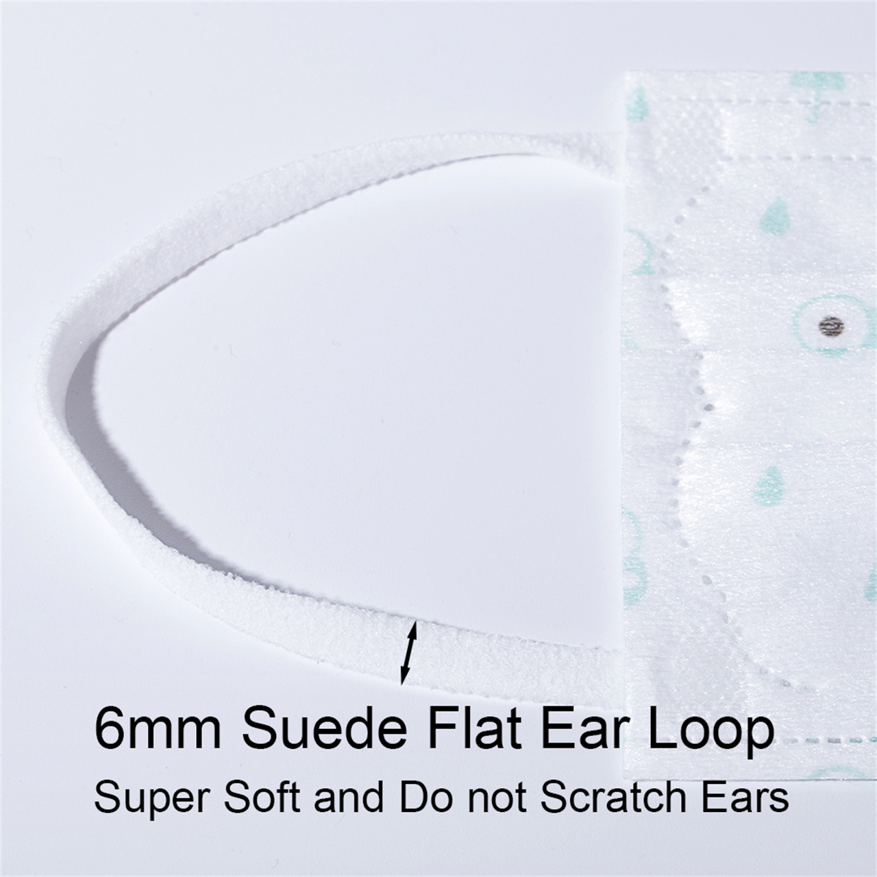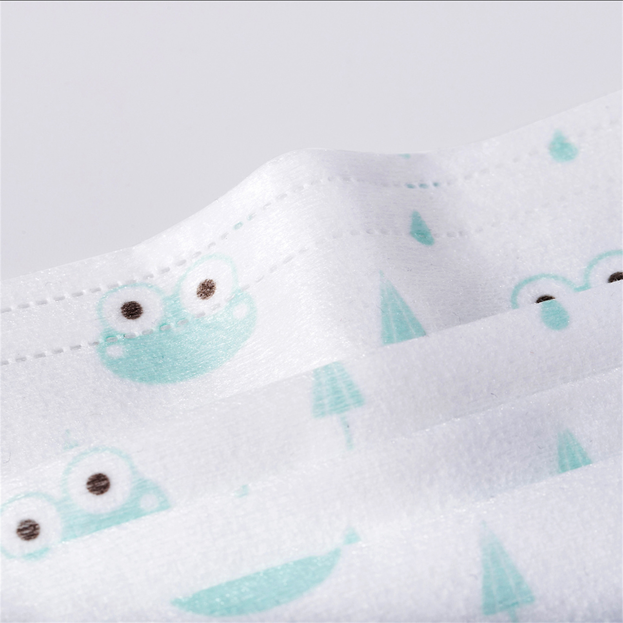 구성요소 | 보호층: 폴리프로필렌 스펀레이스 부직포, 핑크/블루/옐로우/그린 프린팅, 45±2g/m2 필터 레이어: 고성능 폴리프로필렌 부직포, 흰색, 25±2g/m2 구강층: 폴리프로필렌 스펀본드 부직포, 매우 부드럽고 흰색, 22±2g/m2 노즈 브릿지 스트립: 플라스틱으로 덮인 알루미늄 클립 이어 밴드: 폭 6mm의 푹신한 플랫 이어 루프; 씰링 유형: 초음파 | |